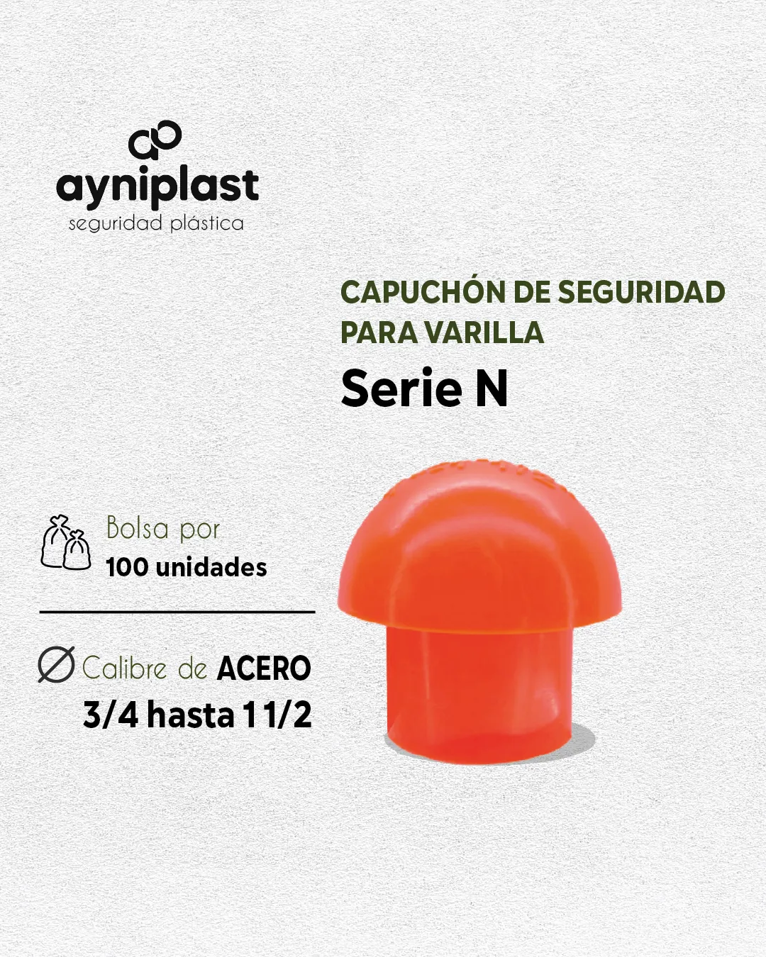 Capuchón de seguridad naranja AYNIPLAST para varillas de ¾″ a 1½″. Polipropileno resistente, alta visibilidad y protección contra impactos en obra.