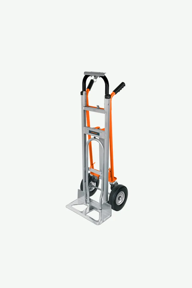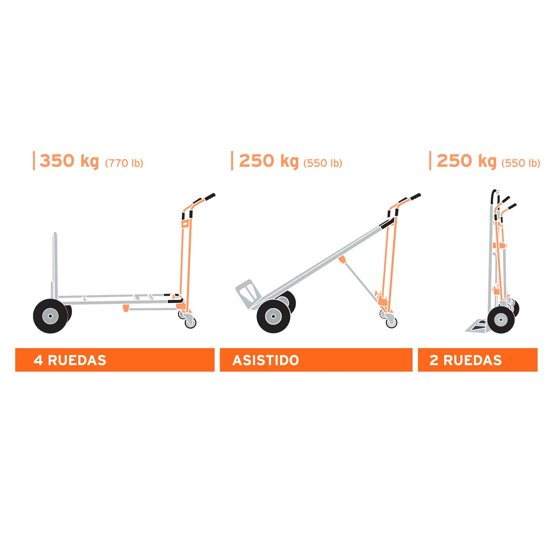 Carreta convertible de aluminio Truper 16188 con capacidad de 350 kg. Versátil 3 en 1, ruedas de hule sólido y estructura resistente, ideal para obra.